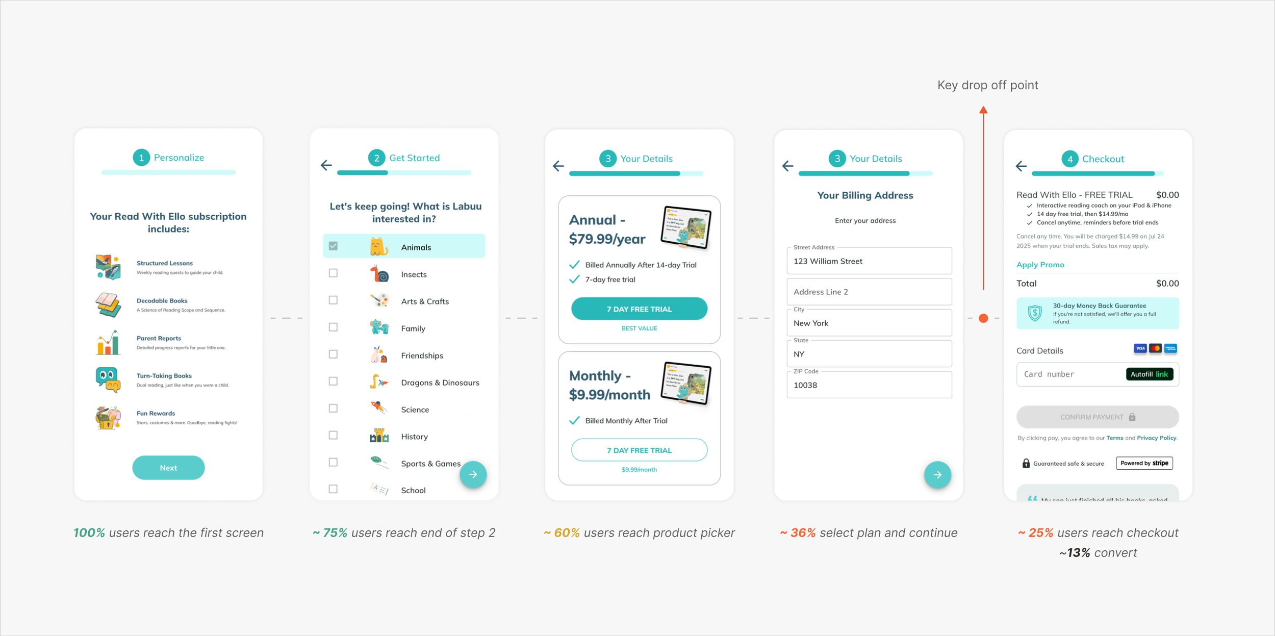 Ello’s onboarding experience presented friction leading to early-stage user drop-off. As the lead product designer, I collaborated with a product manager to identify drop-off points, increase engagement, and drive higher completion rates resulting in paid subscriptions.